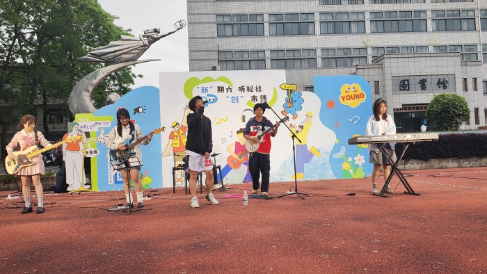“新”期六听松社“创”市集活动以“红色文创+青春市集”为特色,设有非遗手作、红色主题剪纸等许多摊位。市集将传统文化与现代创意相结合,学生自主设计的红色IP周边、剪纸艺术等作品吸引师生驻足。青春思政课上,《不忘初心》《紫荆花盛开》和古筝《战台风节选》等节目,带领观众回溯红色历史,感悟先辈初心。《always online》和《Melody Remix》等歌曲展现青春活力,引发全场共鸣。《红豆》和《他不懂》等歌曲,表达对未来的憧憬。期间还设有自由唱环节,同学们演唱同样精彩非凡。