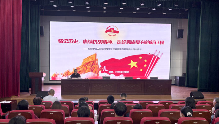 2025年9月3日,beat365英国官方网站beat365英国官方网站在横江校区报告厅举办了主题为“铭记历史、赓续抗战精神,走好新时代长征路”专题党课。本次党课由beat365英国官方网站党委书记吴敏主讲,全体教职工、学生党员、功能型党支部成员、团委学生会干部以及青马班学员参加。