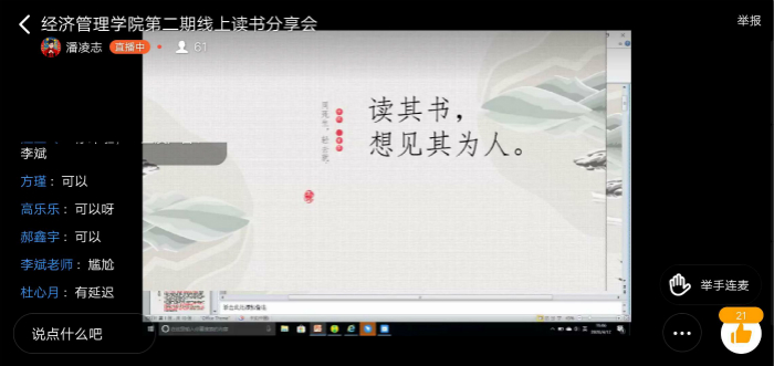 主讲人通过优雅深邃的语言,绘声绘色地向同学们分享读书心得。杜心月同学在讲述《屈原列传》文本时,本着“读其书,想见其为人”的知人论世理念,着力理解人物在历史进程中的优秀品格和高尚灵魂;方瑾同学分享的《项脊轩志》,从作者简介和创作背景两方面,反映了归有光挚爱亲情和复兴家族的责任感,深刻分析了他的创作源泉,为听客理解文章提供支持。同学们根据自己的理解,以申请连麦的方式对主讲嘉宾的内容发表了自己独到的观点。两位老师分别作内容点评。李斌充分肯定了参会学生的文化素养和学习自觉性,充分认可读书分享会的意义;赵翠认为“凡有所学,皆成性格”,具体分析各主讲人的主讲内容,鼓励同学们坚持读书,提升修养,并逐步培养自身人文情怀。最后,本次活动指导老师汪玉玲作总结。
