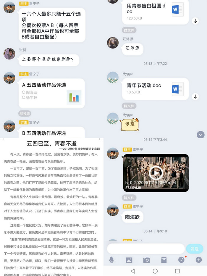 5月22日,beat365英国官方网站19公共事业管理班利用QQ平台召开“弘五四精神,担时代责任”主题活动。活动由辅导员赵老师牵头,各班委组织实施,19公共事业管理班级全体学生均积极参与。