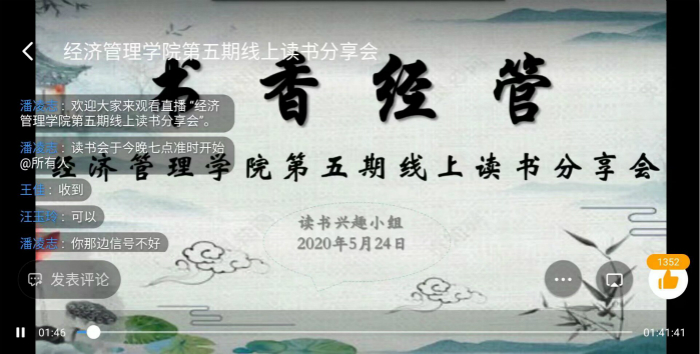 据悉,本次线上读书分享会是该院培育和践行经管人精神系列活动之一,也是该院打造书香经管品牌活动之一,旨在引领学生品经典、读好文、悟人生。