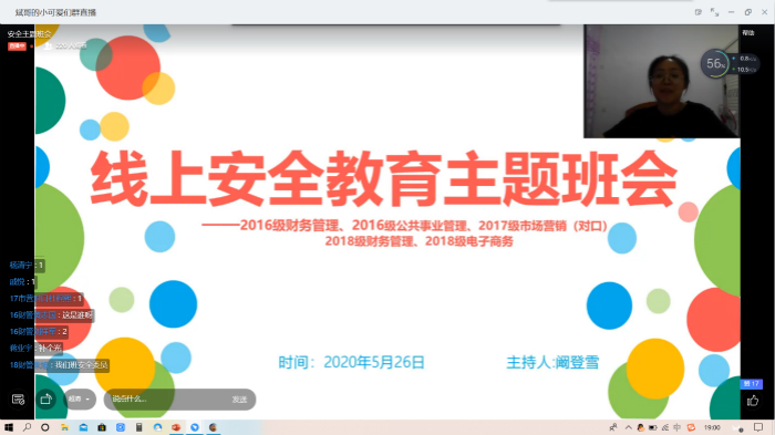 5月26日晚,beat365英国官方网站16级财务管理、16级公共事业管理、17级市场营销对口、18级财务管理以及18级电子商务五个班通过钉钉顺利召开安全主题班会,会议由18财管安全委员阚登雪主持。
