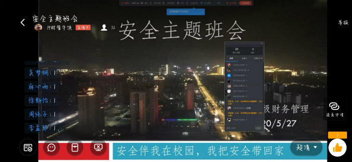 5月27日晚7点,19财管班于钉钉直播了一场有关于安全的主题班会。本次班会由19财管班安全委员牛侠同学主持,19财管班全体同学参与。班会期间同学们认真听讲。积极参与讨论。