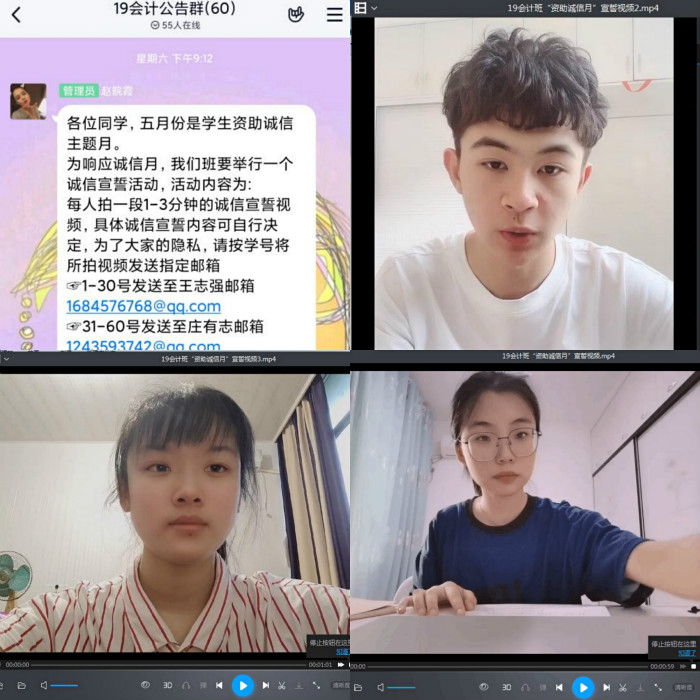活动于五月中旬启动,各班委分工负责,经历了前期的宣传准备、活动策划、在线指导,作品打磨等环节,将国家资助政策与诚信教育的相关文件融于活动的每一个环节,真正实现了资助诚信教育内容的全覆盖。学生自主进行拍摄也极大的动员了普通学生参与班级活动的积极性,既有价值引领,也能通过宣誓活动的仪式感,进一步增强学生对诚信教育的重视程度。