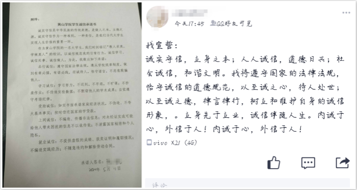 5月下旬,该院组织12个班级近900名同学签订学生诚信承诺书,充分展现了该院同学良好的精神面貌和优秀的道德品质。其中,部分班级还进行了线上宣誓活动,200余名同学积极参加了此活动,并表明了自己诚信做人,回报社会的决心。