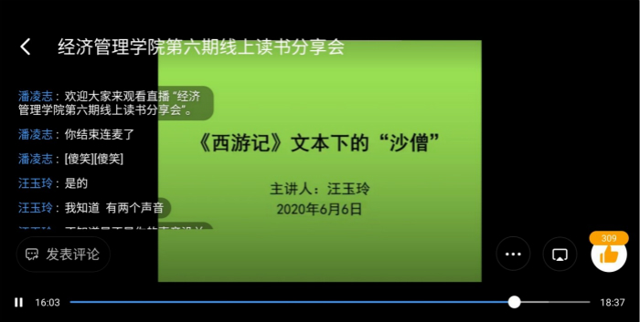 汪玉玲以“《西游记》文本下的沙僧”为主题,通过视频播放和PPT演示两种形式,分享了对古典名著《西游记》(吴承恩著,人民文学出版社)的读书心得。她分别从《西游记》文本的成书历程、作者个人介绍、“沙僧”人物形象分析等三个方面,阐述了《西游记》的艺术价值和写作特征。她认为吴承恩成长的家庭环境和政治环境对小说的人物塑造有着一定的影响,本文中所描写的故事情节讽刺了现实政治环境。此外,她认为“沙僧”具有目标坚定、深谙人情、大局意识等性格特征,是《西游记》文本中不可忽略的人物角色。黄保玉同学以申请连麦方式对汪玉玲的分享内容作出点评,并阐发了个人阅读思考。