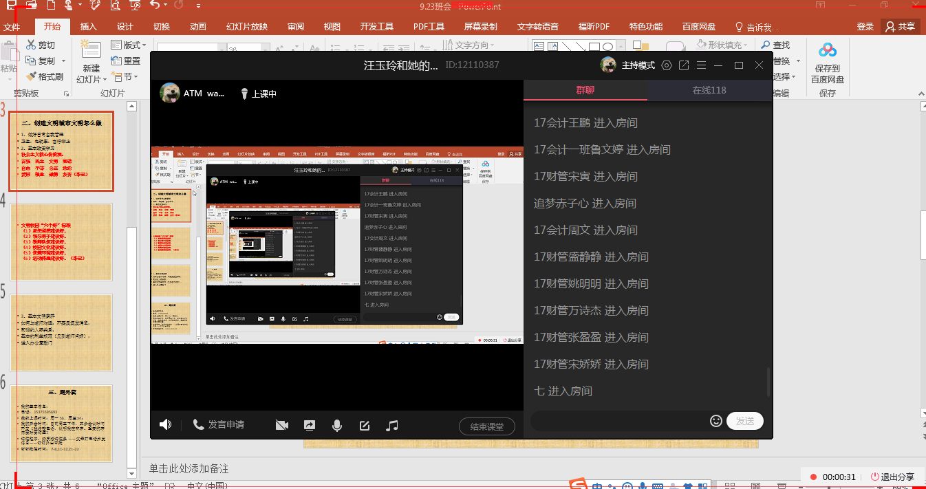 为进一步做好文明城市创建工作,9月23日,17财管、17会计和18会计班通过QQ群课堂召开“文明城市,你我共建”主题班会,会议由辅导员汪玉玲主持。