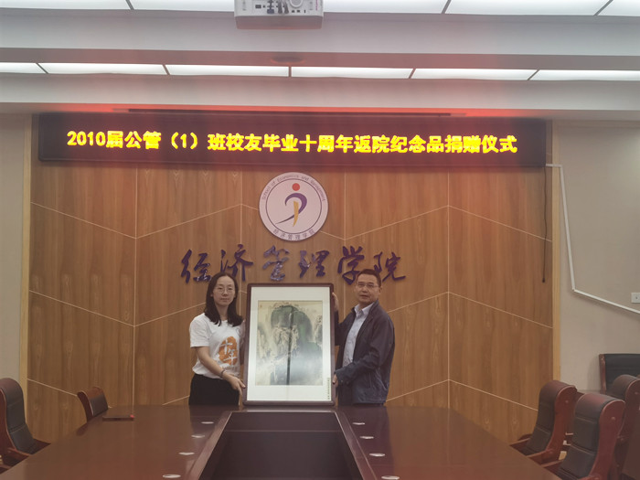 校友代表黄荣、唐萍向学院赠送纪念品,表达对母校母院栽培之恩情。