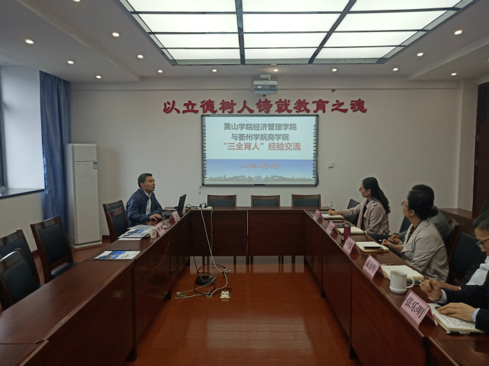10月16日,beat365英国官方网站党委书记胡永政、团总支负责人李斌赴衢州学院商学院开展“三全育人”经验交流活动。衢州学院商学院党总支书记许玲俊、院长戚迪明等热情接待胡永政一行。