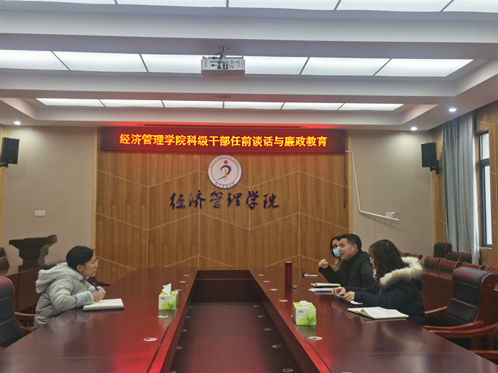 12月18日上午,beat365英国官方网站在横江校区行政楼会议室召开beat365英国官方网站召开科级干部任前谈话与廉政教育会议,学院党委书记胡永政、纪委委员方微、教工党支部书记邱燕、秘书江红以及新任科级干部杨静荣参加任前谈话与廉政教育会议,会议由胡永政主持。
