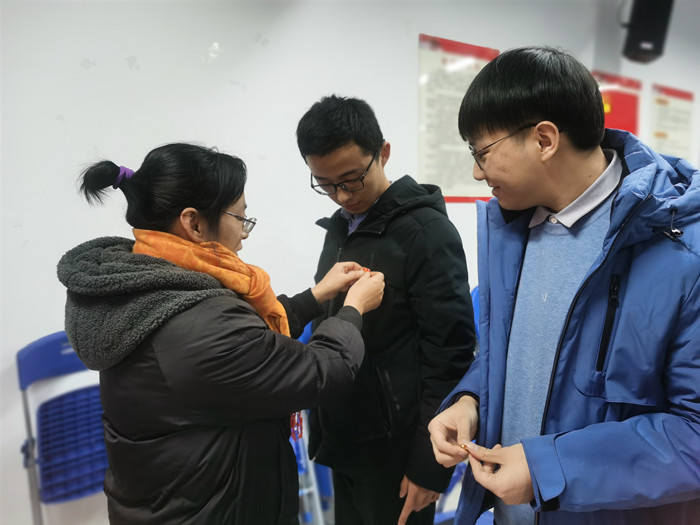 仪式开始,全体起立奏唱《中华人民共和国国歌》。支部书记汪玉玲领誓,2020年下半年入党的预备党员全体起立庄严宣誓,“我志愿加入中国共产党……”,庄严的宣誓表达了新党员对党的忠贞与赤诚之心。 宣誓结束后,四位支部书记为新党员佩戴了党徽,将责任与使命传递到每位新党员心中,指引着新党员要增强党员责任意识,要为党旗增彩,为党徽增光。