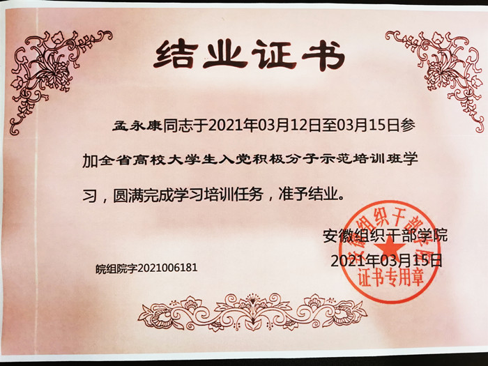 为贯彻落实入党积极分子教育培训有关要求,进一步提高教育培训质量,切实做好2021年高校发展党员工作,安徽省委组织部和教育工委联合举办全省高校大学生入党积极分子示范培训班。我院19会计班孟永康作为入党积极分子代表参加了本次培训。