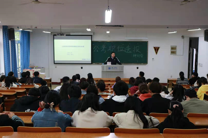 4月7日下午,beat365英国官方网站在横江校区1301教室举办公务员职位报考指导讲座,特邀中博教育公考项目部指导老师周磊作为主讲人,学院百余名学生参加此次讲座。