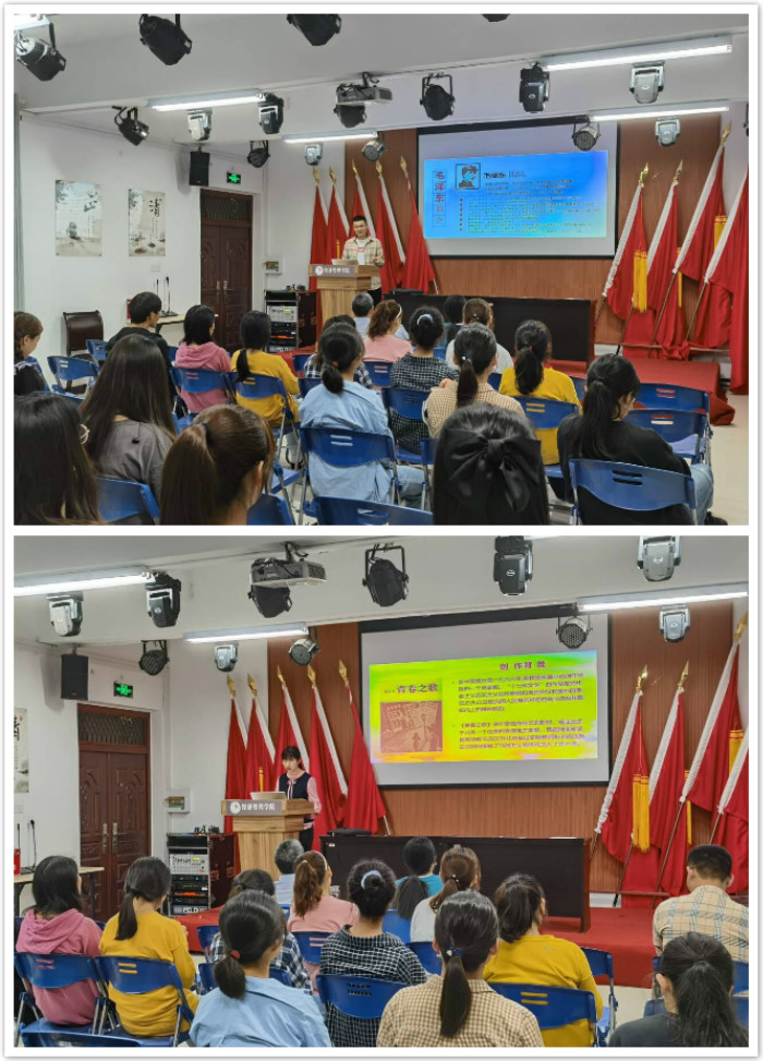 19会计班黄宝玉同学讲述伟大领袖毛泽东主席“学不成名誓不还”的光辉事迹,主要从毛泽东持续学习、坚持锻炼、勤俭节约、逆向思维、独立自主、爱国明志这六个方面来阐述了毛泽东的优秀品质,认为这些具有巨大凝聚力的精神品质是新时代大学生的榜样。文学院18中文专业刘宇曦同学分享的是杨沫的《青春之歌》,此书以“九一八”事变到“一二·九”运动这一历史时期为背景,用高亢激昂的旋律谱写了一曲青春的赞歌。刘宇曦通过生动的故事情节和人物性格分析,彰显了女主人公林道静成为共产主义战士的心路历程。女作家杨沫将那段不可忘却的历史赋予青春以热度,并借助红色记忆和铿锵文字唤起新时代下青年学生心灵深处的强烈共鸣。