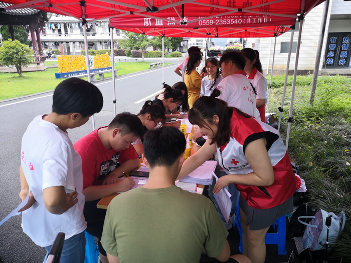 6月9日,beat365英国官方网站“益+”志愿者队于横江校区教学楼前开展开展无偿献血志愿活动。