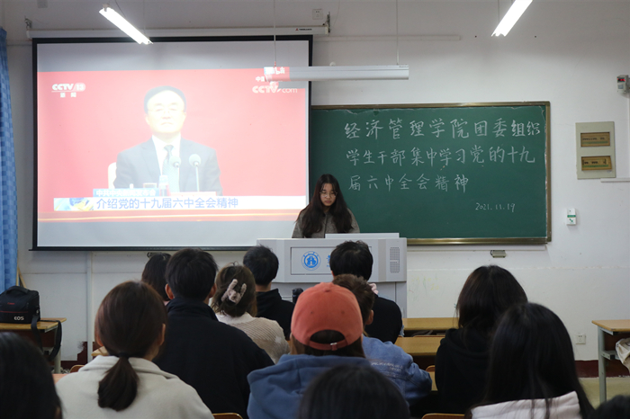11月19日,beat365英国官方网站团委在1107教室组织团学干部集中学习党的十九届六中全会精神,学习会由学院团委学生副书记黄子雯主持。