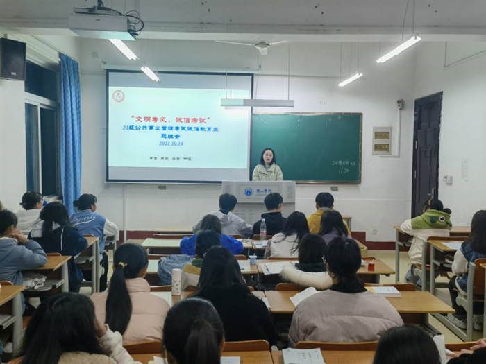 为推进学校诚信考试教育主题活动,加强青年学生诚信考试教育,树立良好的考风考纪,21公共事业管理班于11月30日晚在教学楼1207教室组织开展了“文明考风,诚信考试”主题的班会,班会由辅导员江红主持,21公管全体学生参加会议。