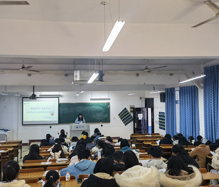 为加强学风、考风、考纪宣传教育,切实营造诚信考试氛围,12月2日上午,2021级财务管理班召开了“树诚信考风,做诚信学子”考试诚信教育主题班会,班会由辅导员汪夏萍主持,21财管班全体同学参加。