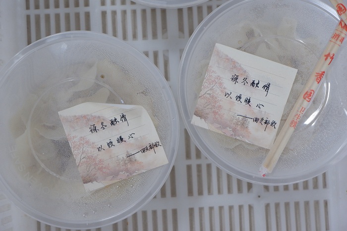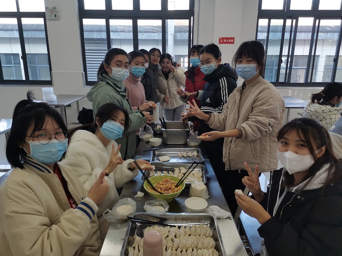 活动伊始,支部党员带领积极分子在食堂阿姨的示范与帮助下,准备食材、制作馅料、一起包制水饺,调制蘸料等。活动现场井然有序,其乐融融;轻松之余,学生们还针对刚刚召开的十九届六中全会和即将面临的期末备考、大四学生的考研、就业等信息展开了交流探讨;随后,学生们将煮好的水饺逐一打包,分别送给老师和考研学长学姐们,表达自己的尊重与感恩,关怀与温情。