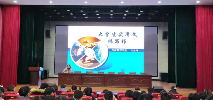 12月4日,院党委委员、专职组织员、学生第二党支部书记汪玉玲老师从生活中列举大学生经常遇到的文体写作,如:通知、策划书、演讲稿、请假条等方面向同学们讲述了大学生实用文体该如何写作。