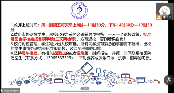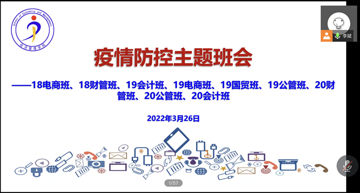 3月26日,beat365英国官方网站18电商班、18财管班、19会计班、19电商班、19国贸班、19公管班、20财管班、20公管班、20会计班九班在腾讯会议联合召开疫情防控主题班会,班会由辅导员李斌主持。