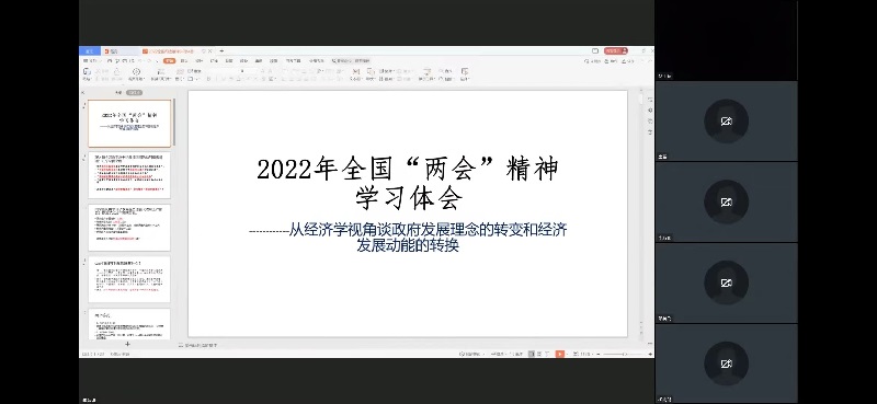胡庆龙结合“两会”精神,从经济学视角谈政府发展理念的转变和经济发展动能的转换。会上学习了习近平总书记重要讲话关于“五个必由之路”丰富内涵和李克强总理作2022年《政府工作报告》精彩内容,重点分析了GDP预期目标下调为5.5%的原因和应对之策,阐述了供给侧结构性改革和提高全要素生产率是增强我国经济创新力和竞争力的有力措施。胡庆龙以专业视角,鞭辟入里分析,加深了大家对“两会”精神学习,坚定大学对2022年经济社会发展的信心。