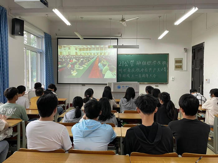 为庆祝共产主义青年团成立一百周年,深刻领悟习近平总书记重要讲话精神,5月10日上午,21公管班全体学生集中观看庆祝中国共产主义青年团成立100周年大会。