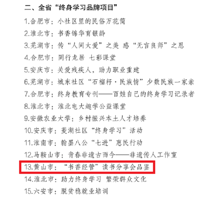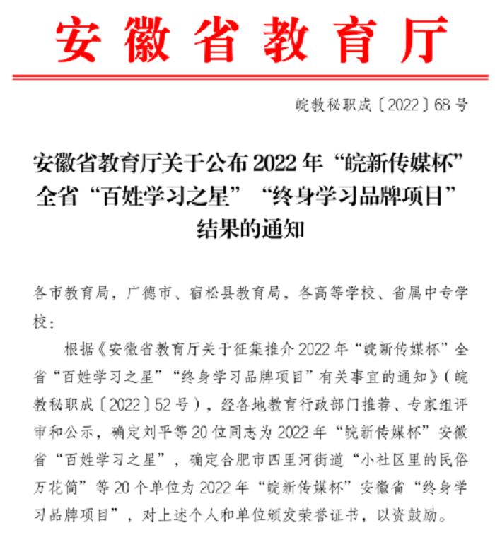 近日,安徽省教育厅下发关于公布2022年“皖新传媒杯”全省“百姓之星”“终身学习品牌项目”的通知。我院“书香经管”读书分享会品鉴荣获全省“终身学习品牌项目”。