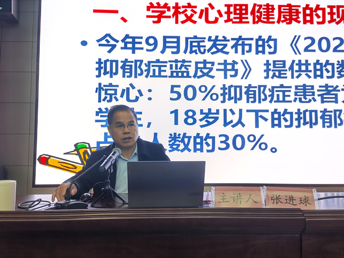 报告会上,张进球结合自身工作经验从学校心理健康的现状、大学生常见心理问题、大学生心理问题成因、大学生心理问题应对和大学生压力源的思考五个方面,用一个个生动的案例详细分析了大学生应该如何做一个健康、向上、阳光的新时代青年。