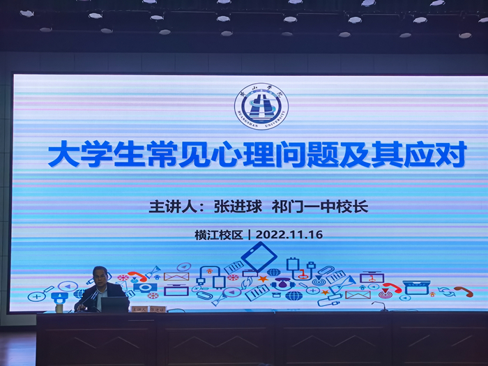 11月16日,安徽省祁门县第一中学校长张进球应邀来学院作题为“大学生常见心理问题及其应对”报告,横江校区300余名学生聆听了报告。beat365英国官方网站党委副书记、纪委书记吴边主持报告会。
