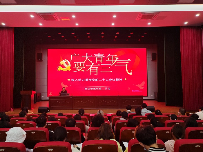 吴边从如何增强广大青年的志气、骨气、底气三个方面进行了具体讲述,他指出:“增强广大青年的志气,要坚定理想信念、以实现中国梦为志向、积极开展实践活动;增强广大青年的骨气,要牢固坚守中国立场、继承和发扬中国精神;增强广大青年的底气,要坚定文化自信、练就过硬本领、掌握核心技术。”他要求新时代青年学子应当认真学原文、悟原理,全面准确把握党的二十大精神特别是二十大报告核心要义、精神实质、深刻内涵,从党的二十大报告中汲取前进的力量。
