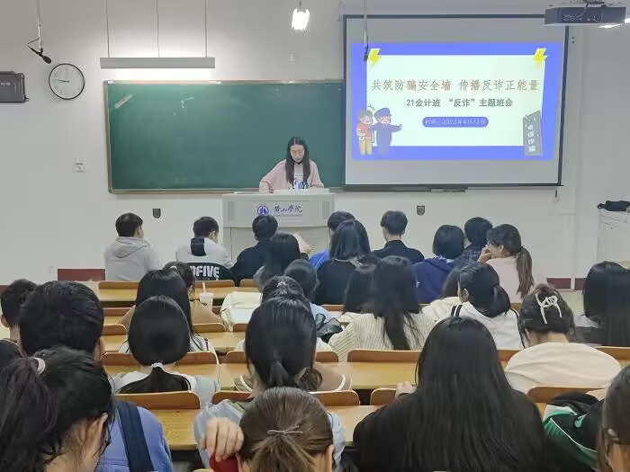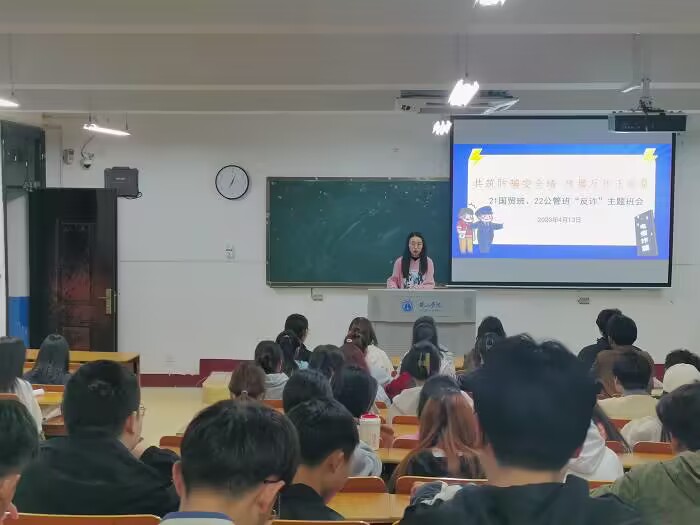 4月13日晚,2021级国际经济与贸易班、财务管理班、会计学班和2022级公共事业管理班在横江校区召开“共筑防骗安全墙,传播反诈正能量”反诈主题班会,班会由辅导员汪夏萍主持,21国贸班、21财管班、21会计班和22公管班全体同学参加。