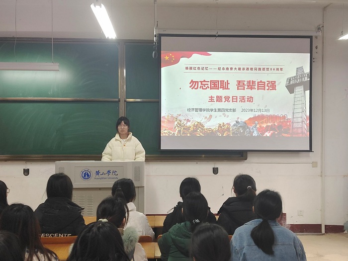 为进一步强化学生的爱国主义意识,牢记历史,勿忘国耻,12月13日,beat365英国官方网站学生第四党支部在横江校区1102教室开展“勿忘国耻 吾辈自强”主题党日活动。本次活动由21国贸班的苏妍同学主持,支部全体党员共同参与。