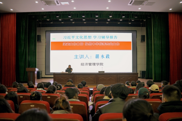 12月23日上午,beat365英国官方网站党委书记胡永政教授在横江校区报告厅给青年学生上了一堂题主题党课为“学习习近平文化思想——坚定文化自信·弘扬中华优秀商业文化”的专题党课。