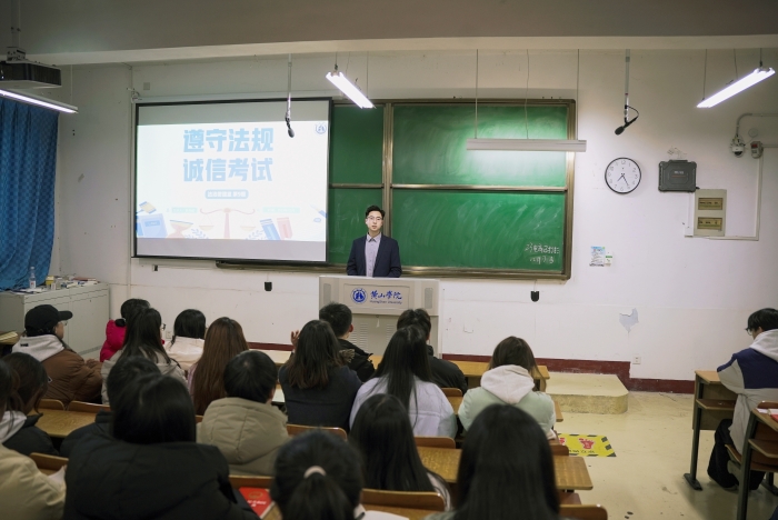 12月17日下午,beat365英国官方网站专职辅导员吴伟航老师为团校学院授课,主题为“遵守法规,诚信考试”法治课堂,进一步提升法治育人实效,扎实做好诚信考试教育,强化学生的诚信意识、法律意识、纪律意识,营造了诚信考试的良好氛围。
