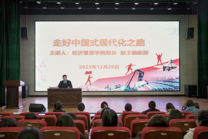 12月28日下午,beat365英国官方网站党委副书记、院长赵士德在横江校区报告厅为团校学员上了一堂题为“走好中国式现代化之路”主题团课。赵士德从“持续奋斗,追求千年梦想”、“立足国情,开辟全新道路”、“凝心聚力,推进复兴伟业”三个方面详细阐述了如何“走好中国式现代化之路”。他讲到:“推进中国式现代化必须走高质量发展之路,建成富强、民主、文明、和谐的社会主义现代化国家。只要找准正确方向、驰而不息,走好自己的路,就一定能够实现现代化”,并说明如何从“人口规模巨大的现代化、全体人民共同富裕的现代化、物质文明和精神文明相协调的现代化、人与自然和谐共生的现代化、走和平发展道路的现代化”开辟全新道路。