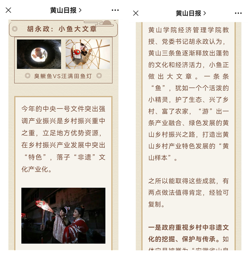 3月13日《黄山日报》围绕黄山市实施乡村振兴战略采访我院教授胡永政,并以《小鱼大文章》报道专家之声。胡永政教授从“臭鳜鱼、泉水鱼、徽州鱼灯”视角分析黄山市全面推进乡村振兴战略,突出立足地方优势资源,在乡村振兴产业发展中突出“特色”,落子“非遗”文化产业的典型案例,实现小鱼做出大文章,一条条“鱼”,犹如一个个活泼的小精灵,护了生态、兴了乡村、富了农家,“游”出一条产业融合、绿色发展的黄山乡村乡村振兴之路,打造了黄山乡村产业特色发展的“黄山样榜”。