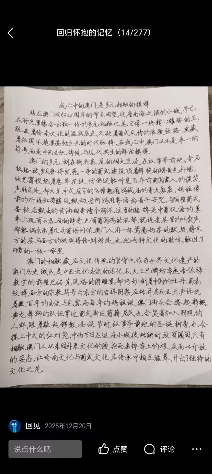 “澳门回归是祖国统一大业的重要一步,一国两制在澳门的成功实践,为维护港澳繁荣稳定提供了根本保障。”营销协会负责人在活动中表示,希望通过此次线上活动,让青年学生从历史与现实结合的视角认识国家统一的意义,激发家国情怀与民族自豪感,同时凝聚社团成员的思想共识。后续,协会将继续结合重要历史节点,推出兼具教育性与互动性的校园活动,引导青年学子厚植爱国情怀,增强民族认同感。