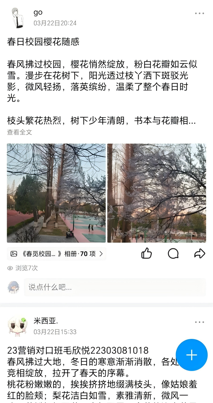 为响应素质教育号召,引导学生走出课堂、亲近自然,提升生态感知力与审美素养,2026年3月22日,营销协会线上举办的“春觅校园,绘影自然”主题活动圆满结束。本次活动以校园自然生态为载体,鼓励学生以观察、记录、创作等方式感知季节更迭,在实践中深化对自然美学与人文环境的理解,吸引众多同学积极参与。