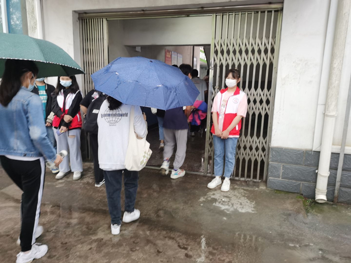 志愿者们身穿红色马甲站在教学楼门口两边对进出教学楼的同学们让他们佩带好口罩,对于未佩戴口罩的同学,如果时间允许,建议同学回宿舍取口罩佩戴,如果时间不允许,会分发提前准备好的口罩,引导同学们养成科学规范佩戴口罩的习惯,切实提高自我防护意识。
