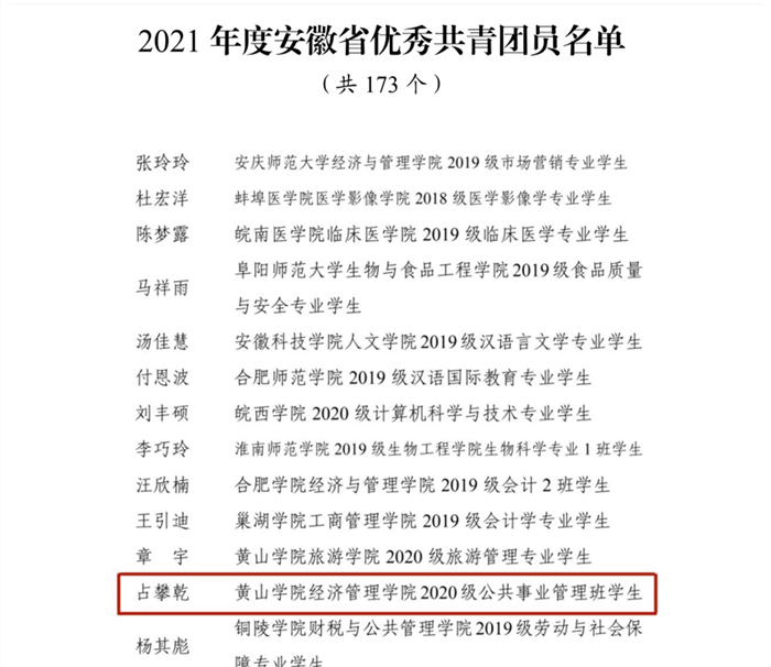 近日,共青团安徽省委员会公布2021年度安徽省“两红两优”评选表彰结果,我院2020级公共事业管理班占攀乾同学荣获“安徽省优秀共青团员”称号。