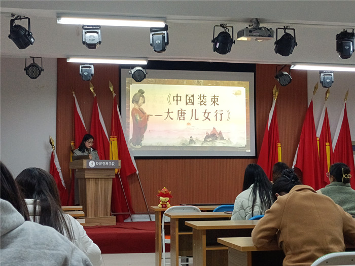 21应用统计郜雨悦以唐朝夜宴的经典表演开篇、以生动的语言向现场参加活动的师生分享《中国装束——大唐儿女行》一书,让我们从穿搭、头饰、发型以及妆容这四个方面了解了唐朝时期女性独特的审美风格,也让大家了解到唐朝不同时期女性装束背后对于女子的社会地位的不同暗示。