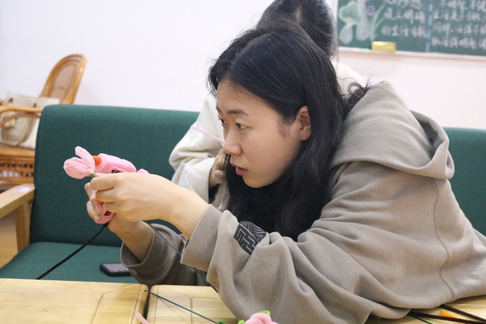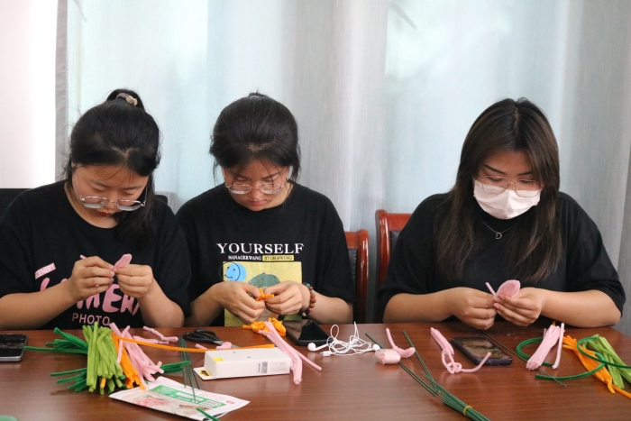 活动伊始,主持人向同学们介绍了活动内容和扭扭棒的基本制作方法,随后同学们便领取彩色扭扭棒和胶带等材料,开始了自己的创作。活动过程中,同学们用绕、弯、剪、缠、扭等不同方法制作花朵,在一扭一折之间,参与的同学们逐渐卸下了心中的压力,慢慢放松下来,将注意力都集中在小小的扭扭棒上,向日葵、郁金香,很快一根根小小的扭扭棒就变成了一朵朵艺术品。活动最后,全体成员一起合影留恋。