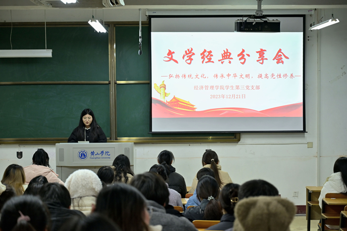 12月21日,beat365英国官方网站学生第三党支部在横江校区1102教室开展以“弘扬传统文化 传承中华文明 提高党性修养”为主题的文学经典分享活动。本次活动由支部党员22营销对口班张国萱同学主持,支部党员、入党积极分子、22国贸班团支部全体同学共同参与,支部书记蒋璐璐到场指导。