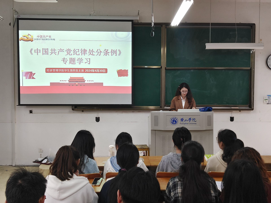 为加强党员的纪律意识和廉洁意识,筑牢思想防线,4月30日上午,学生第四党支部在横江校区1101教室开展《中国共产党纪律处分条例》专题学习,活动由支部书记汪琼霞主持,全体学生党员参加。