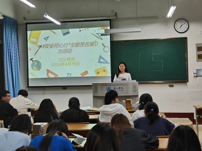 4月15日晚,2022级公共事业管理班在横江校区1107教室开展“415安全同心行”主题签名接力活动,活动由易班班长孟利芳主持,班级全体同学共同参加。