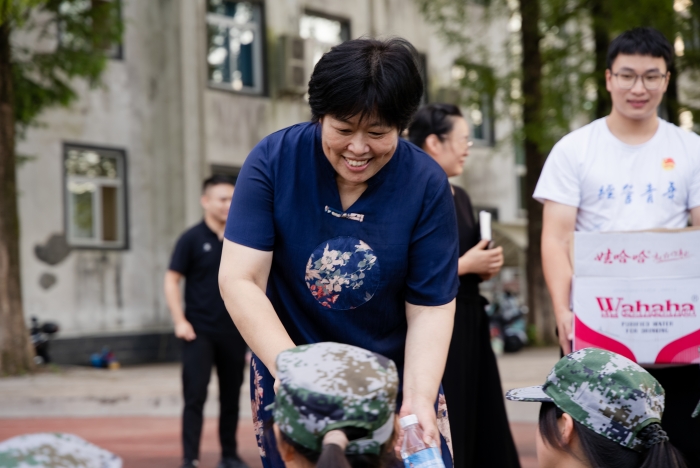 军训现场,吴敏代表学院向承训教官的辛勤付出表示衷心的感谢和崇高的敬意,向全体参训新生表示慰问,并提前向同学们致以中秋节问候。她指出,军训是大学生活的第一课,这堂课责任重大、意义非凡,不仅是提高身体素质的难得机会,更是磨砺意志、增强国防观念、弘扬爱国主义精神的重要一课。