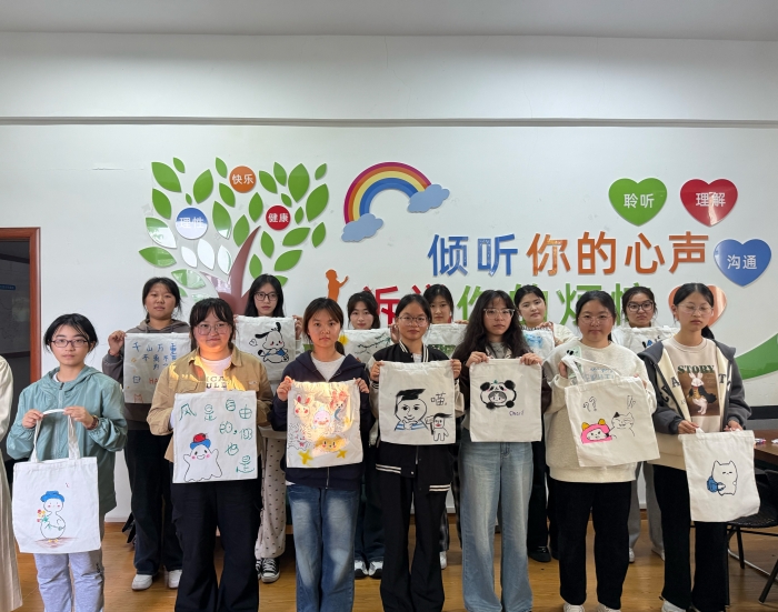 心理辅导站成员安排参与者有序入座,主持人开场并对活动内容进行介绍,围绕活动主题进行心理辅导,调动现场气氛。心理辅导站成员与同学们进行emoji猜成语小游戏和绘制特别的DIY手工帆布包,同学们积极参与,现场充满欢声笑语,活动气氛欢快。