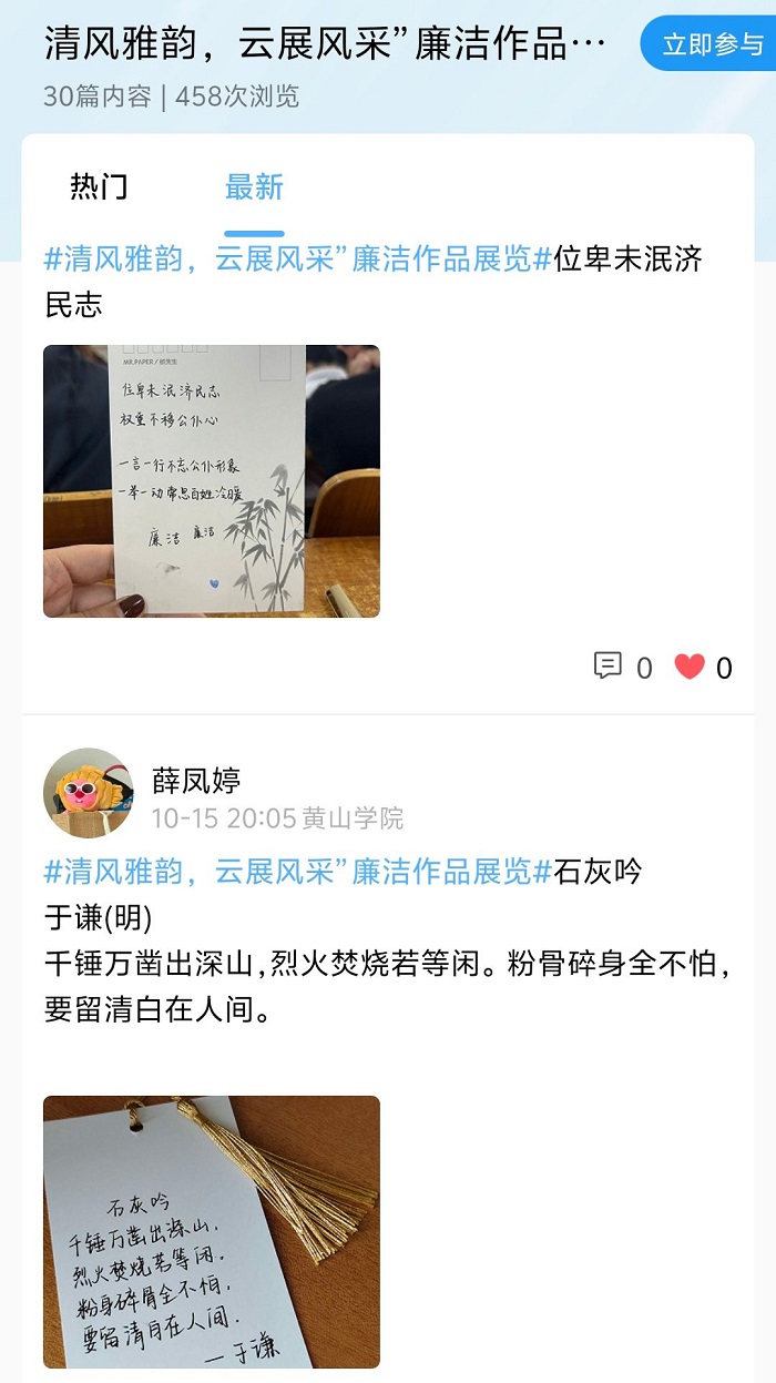 线上开展“清风雅韵,云展风采”活动,本次活动主要包括作品展览与心得分享两个环节。同学们将自己创作的以廉洁为主题的手工作品上传至易瞄瞄,并分享创作中的感悟和经验。在制作过程中,同学们不仅锻炼了动手能力,充分展示了自己的才华与创意,更体现了同学们对廉洁文化的高度重视和积极践行,丰富了校园文化内涵。