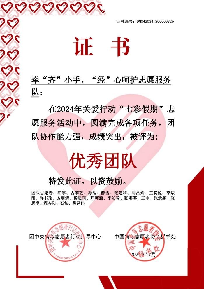 近日,我院牵“齐”小手·“经”心呵护志愿服务队在全国2024年关爱行动“七彩假期”志愿服务活动中,圆满完成各项任务,团队协作能力强,成绩突出,被评为优秀团队。